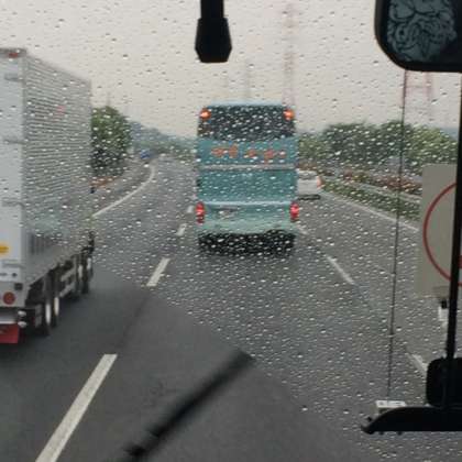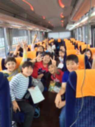 外は生憎の雨模様ですが、バス車内はカラオケやクイズで