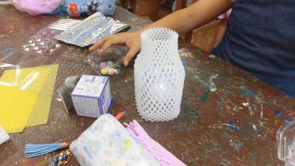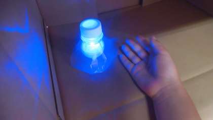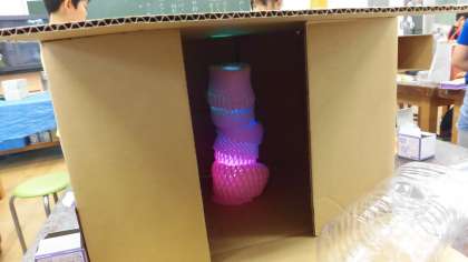 段ボールの中でライトを光らせて、材料見え方の変化や