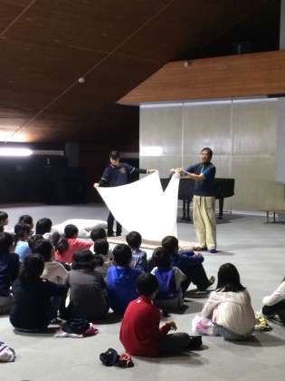 村の会堂では、補助員の先生にシーツ、枕カバーの付け方を