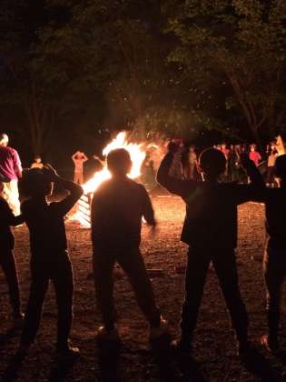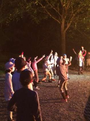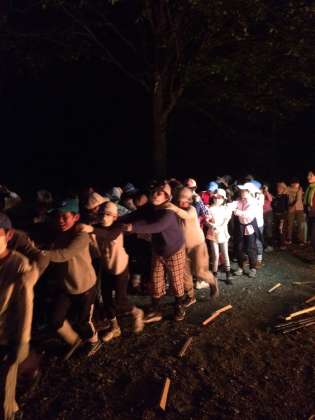 キャンプファイヤー係のリードで盛り上がっています。猛獣狩りに行こう、恋ダンス、ジャンケン列車…