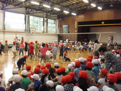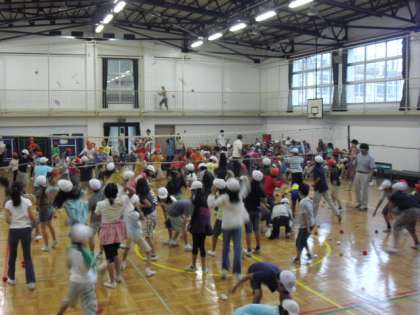学年ごとに、ネットをはさんで、紅白玉を投げ入れるゲームです。低学年は、ネットの下から。3年生以上は、ネットの上から、相手チームに玉を投げ入れていました。