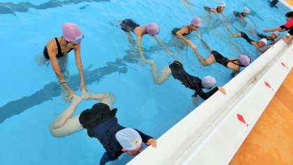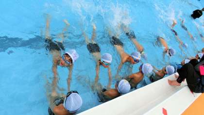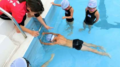 高学年では、平泳ぎの足の練習を全体で行いました。