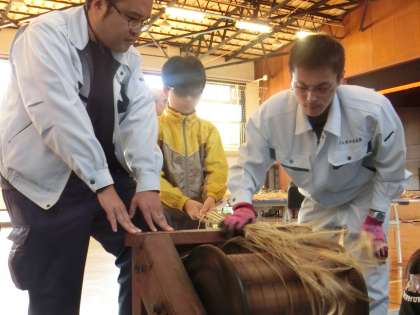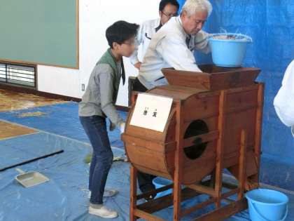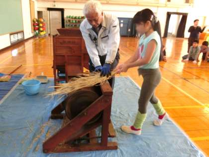 用いて脱穀しました。子どもたちは、日本の伝統的な脱穀に