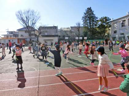 中休みには、全校児童が校庭に出て、短なわ跳びを行いました。