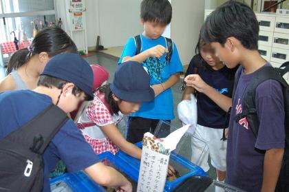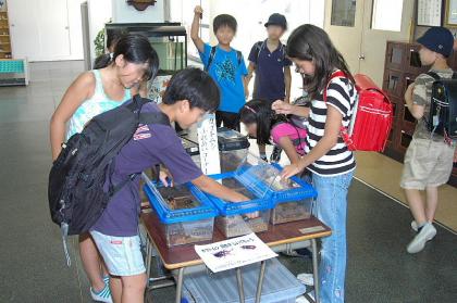 玄関ホールのカブトムシコーナーが子どもたちでにぎわっています。これは、子どもたちに本物の生き物に親しませようと企画したものです。夏休みから飼育しているカブトムシは、すでに次世代へのバトンタッチを終えて、短い一生を終わらせようとしている時期になっています。(すでに産卵し、一部は孵化して幼虫が育っています)