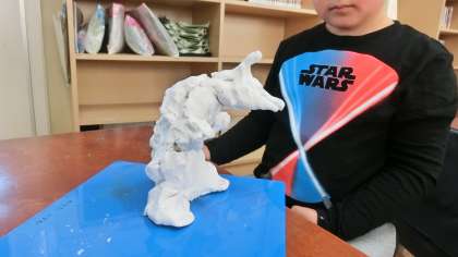 2年生は立体作品「ひみつのグアナコ」の仕上げをしています。