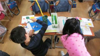 自分の絵の具セットを使って、カラフルに色を塗りました。