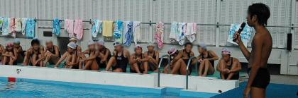 最後は2校一緒に自由泳ぎの時間をとった後、閉会式。九品仏小学校の代表児童の言葉と校長先生の言葉で締めくくりました。この日は地域の方にもタイム測定のお手伝いをいただきました。徒歩で来校していただいた九品仏小学校の皆さんには、この場を借りて改めて感謝いたします。