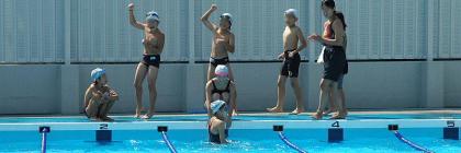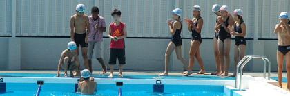 個人の記録を計測した後、チーム対抗リレーを行いました。対抗とは言っても、親睦を深めるためにみんなでお互いを応援しました。チームの最終泳者がゴールする度に、歓声が揚がり、最後のチームの最終泳者がスタートしたときには、自然にみんなから手拍子が起こり、ゴールでは大きな大きな拍手が起こりました。見学者も、応援や記録のお手伝いなど自主的に活動しました。みんなが一つになり一人一人が満足できた最終日でした。