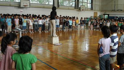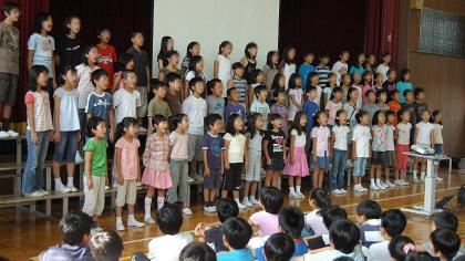 17日の朝は音楽朝会を体育館でしました。最初に合唱団が見本として練習の成果を披露し、「ゆかいに歩けば」の曲を美しい声で歌いました。その後、合唱団に負けないくらいの元気な声で、全員で合唱しました。音楽朝会は、会を重ねるごとに歌声がよく響くようになってきています。