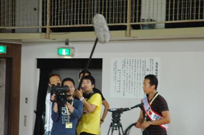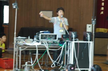 音声の説明です。フワフワのついたマイクのお話と、時には百本以上のマイクの音量調整をするというミキサーに子どもたちも興味津々です。一つ一つの楽器の音を重ねて音楽演奏をつくりだしていくようすもよくわかりました。
