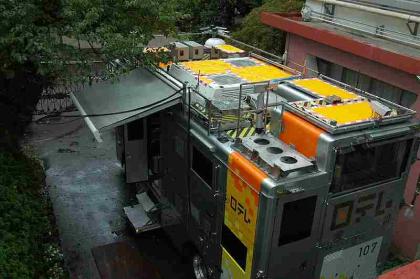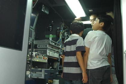 大きな中継車です。例の番組の24時間マラソンで使った車だそうです。正門の内側に止めているところを2階から撮った写真です。屋根にもいろいろな機械がついているのですね。見学コーナーでは、思ったより狭い室内にびっしりと並んだ放送機材にびっくりしていました。