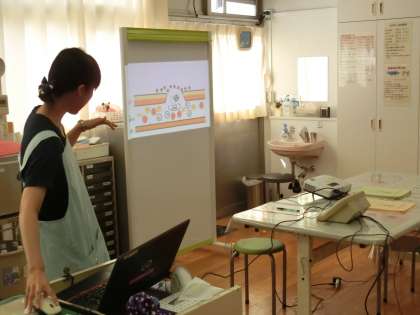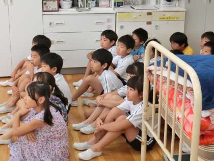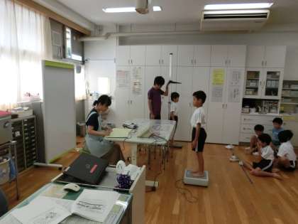 今日は1.2年生の計測です。2年生は計測の前に、けがをしたときの対応について保健指導もありました。子どもたちは真剣な表情で画面を見つめていました。