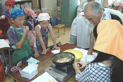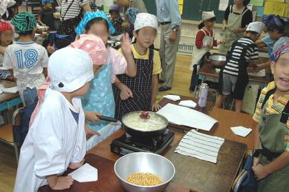 22日、1・2時間目に2年生がポップコーンパーティーを行いました。保護者の皆様に道具を持ち寄っていただき、さらにお手伝いをしていただいたおかげで、子どもたちは楽しくポップコーンを作り、おいしくいただくことができました。また、生活科でポップコーンやその他の作物の栽培のお手伝いをしていただいている、「銀雄クラブ」の皆様をお招きしました。作るところから、子どもたちと一緒に楽しんでいただきありがとうございました。フライパンの中でポンポンはねたり、あっという間にふくらむコーンを見て、子どもたちはおおはしゃぎ。とても楽しいひと時となりました。また、自分で育てたコーンから作った食べ物は、ひときわおいしく感じたようです。