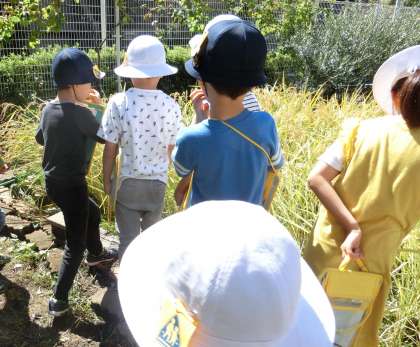 子どもたちはトンボが飛んでいるのを見つけ、秋の訪れを感じていました。