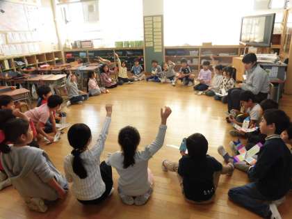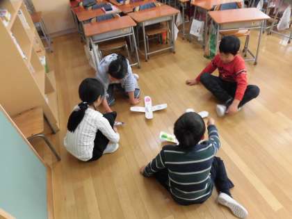 作ったこまをみんなで回して見せ合い、「きれいでしょう」「ユニークでしょう」「よく回るでしょう」を選びました。