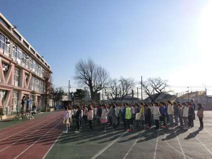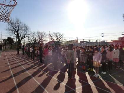 春のような温かい日差しの中、校庭で朝会が行われました。