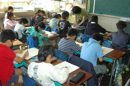 3年生はハサミを描きました。テーマは立体的に描くこと。よく見ると平面ではありません。見る角度でも形は違います。刃の角度の所も難しいし。持ち手のカーブはもっと難しい。なかなか手強いぞ。それでも低学年とは違う観察力で、黒フェルトペンだけでしっかりと立体的に描けていました。
