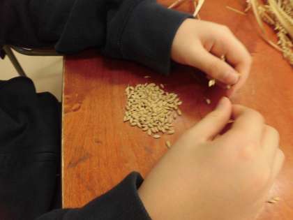 わりばしや牛乳パックなど、意外と簡単に手作業で脱穀できることがわかり、集中して作業をしていました。途中、「どのようにするとより脱穀が効率的にできるか。」「手作業だとやはり大変だ。」など、白米になるまでの苦労を実感しながらすすめていました。袋いっぱいに集まったもみの重さを感じて、どの子も満足していました。