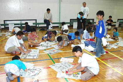 5日(日)、14時から、おやじの会主催の「紙ヒコーキ飛ばし大会」が、体育館で開かれました。開会式の後、まず紙に思い思いのデザインを描いてから紙飛行機を折ります。見本のおり方は掲示してあるのですが、子どもたちの独創的な紙飛行機が出来上がりました。最初の種目は距離競技です。1・2・3年の部と4・5・6年の部に分かれて競いました。(写真は低学年の部)〜つづく〜