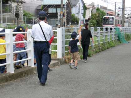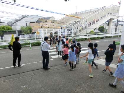 交通安全についての話を聞いた後、横断歩道や跨線橋の渡り方を教えていただきました。