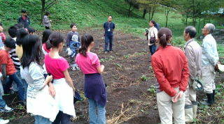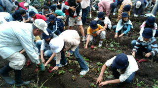 農作業開始。サツマイモ掘りに素手で挑戦。土の感触にキャーキャーいいながら喜んで掘っています。天候はどんどん回復しています。