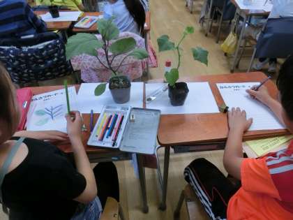 2年生は八幡ファームで野菜を育てます。ミニトマト、なす、きゅうりなどいろいろな苗があります。