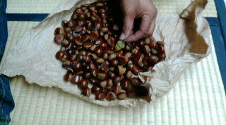 山登りの収穫です。学校で育てている米と一緒に栗ご飯にしようということで、子どもたちが山栗を拾いました。