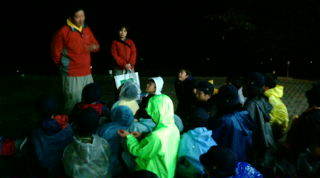 ナイトハイク出発。クラスごとにスタッフの方が2名ついて、説明を受け、出かけます。