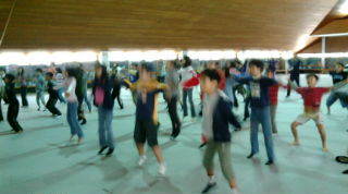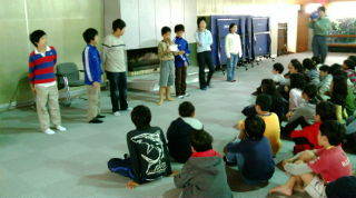 三日目、最終日です。おはようございます。朝から雨が降っています。天気予報では、9時頃には雨はあがるということですが!?朝会は体育館のような村の会堂で行いました。