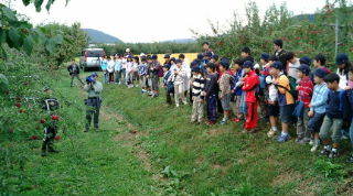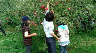 リンゴ園でリンゴとジュースをいただき、その後リンゴがりをしました。真っ赤なリンゴを選んで、大事に一生懸命磨いて持ち帰ります。