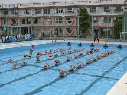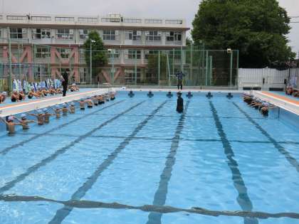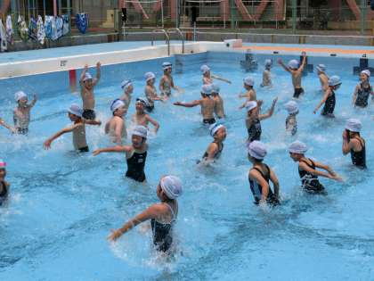 水に入ってからも声を出したくなる気持ちをこらえ、しっかりと話をきく1年生。