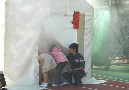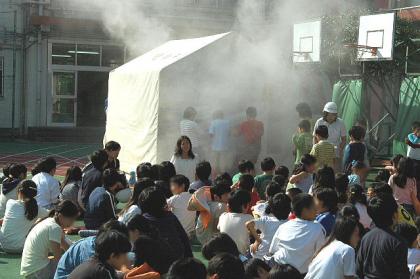 避難訓練の後、3年生と6年生が残って、「煙体験」をしました。これは今年から取り入れた訓練で、世田谷区玉川支所の協力を得て行いました。煙(人体に影響のないもの)を充満させた「煙中テント」を設置してもらい、4・5人ずつテントにはいり、火災の時に発生する煙の中で、どのように行動すればよいのかを学ぶ訓練です。「全然前が見えなかったよ」「本物の火事だったら大変だね」という感想が子どもたちから出ました。そのような時にどうすればよいのかを、改めて考えさせなければと考えています。今後も卒業まで少なくても1回体験できるよう、毎年実施していく予定です。