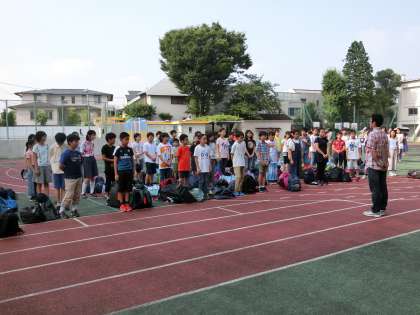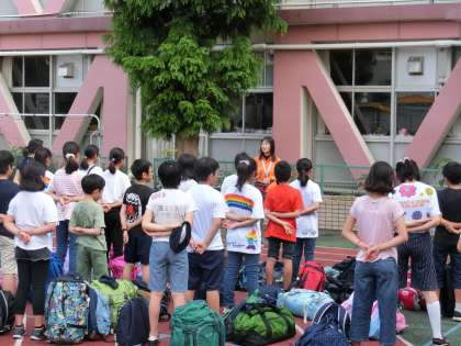 集合時刻が近づくと、大きな荷物を持って6年生がぞくぞくと集まってきました。