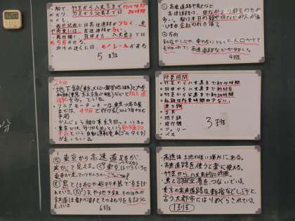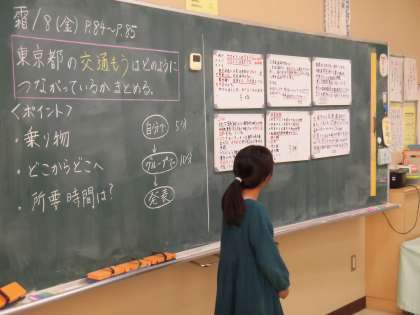 学習のめあてについて、教科書や地図帳を使いながら自分で考え、それをもとにグループで話し合います。意見をまとめるときは、ホワイトボードを活用しました。話し合ったことを、全体の前で発表し、皆で理解を深めていきます。今回は、東京都の交通網の広がりについて学びました。