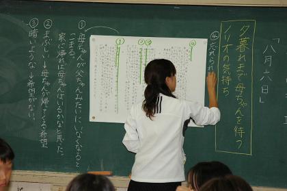 15日(水)、6年担任山尾教諭の研究授業を行いました。これは、新任から4年目の研修として義務付けられているもので、区教育委員会から指導力向上サポーターの先生にもいらしていただき、校長・副校長、空き時間の教員が参観しました。2時間目は国語、3時間目は社会の授業を行いました。国語は「川とノリオ」の「八月六日」の場面を、「言葉のクロッキー」と題して、子どもたちが読み、自分の考えを書き込んでいく学習を行いました。どの子もワークシートに自分が感じたこと、考えたことをていねいにたくさん書きこんでいて感心しました。〜つづく〜