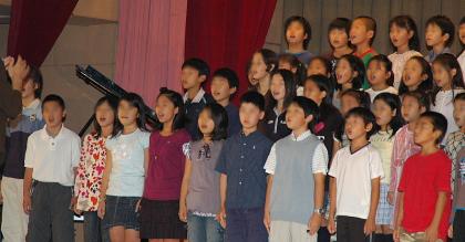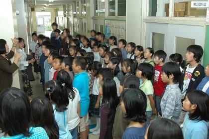 19日(土)、八幡中学校の「学習発表会」があり、本校の合唱団が出演して合唱を2曲披露してきました。11時半に八幡中学校に集合し、校舎の廊下でウォーミングアップ。前のプログラムが多少遅れ気味であったこともあり、予定より遅くの出演になりましたが、会場は満員。はじめてのぼる中学校の舞台、そしてずらりと並んだ中学生を前にして緊張気味の子どもたち。1曲目は「ゆかいに歩けば」です。中学生の演技や歌とはちがう子どもらしい透き通った声が体育館に響き、会場の中学生や保護者も静かに聞き入っていました。〜つづく〜