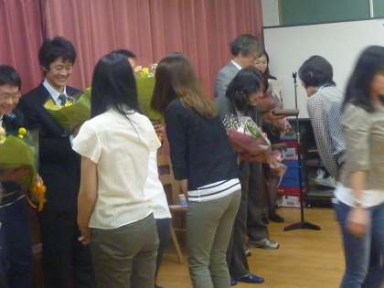 本日、PTAによる歓送迎会が行われました。去られた教職員の方々や、一年間お世話になったPTA役員の皆さんに感謝の言葉や花束が贈られました。また、新しくこられた先生や地域の方々の紹介も行われました。