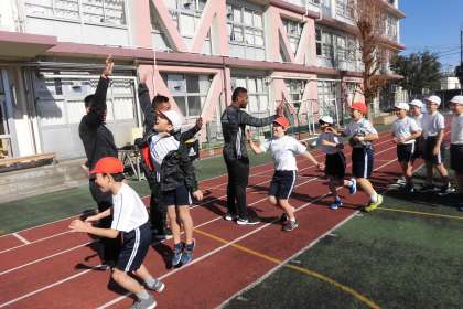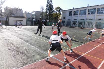 世田谷区のラグビーチーム、リコーブラックラムズの選手をお招きしてラグビー教室を行いました。昨年のワールドカップを見てラグビーへの関心を高めている子どもたちが多く、この日をとても楽しみにしていました。授業ではタグラグビーを楽しみました。