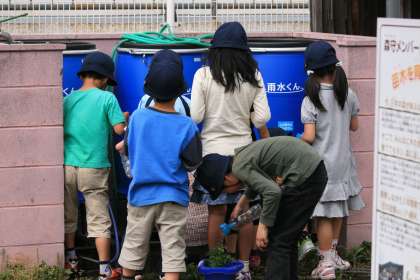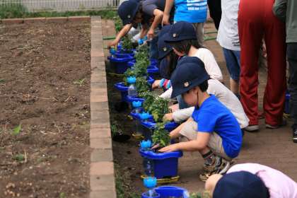 今日は晴天!お日様がカンカンに照らす中、2年生は元気にミニトマトの苗を植えました。そのあと、「雨水君」からボトルに水を入れて、それぞれの苗に大切そうにかけていました。たくさんトマトがなりますように!