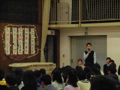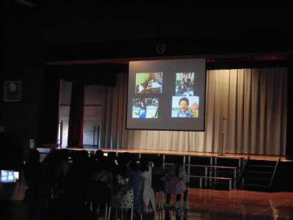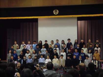 2時間目は、各クラスで「将来の自分」についてスピーチをしました。3時間目は、体育館で自分たちの幼少期の写真を見ながら、「将来の夢」について宣言しました。そして、自分たちで言葉を考えた「感謝と未来へ」の呼びかけをしました。ベルの合奏や歌も交え、自分たちの思いを伝えました。最後に、「エンディングムービー」を上映しました。4年生の実行委員を中心に、全て自分たちで作りました。