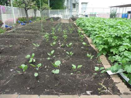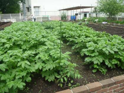 今年の植物、少し心配だったが、生育は順調。特に銀雄クラブの方々の支援で行われたジャガイモは見事な葉を茂らせている。また、トウモロコシもしっかり芽を出した。八幡グリーンサポーターの方に支援いただいた稲の植え付けも終了。緑のカーテン作りに使用するヘチマやヒョウタンの芽も少しずつ出てきた。