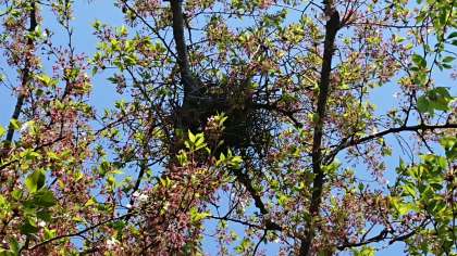 カラスの巣です。巣作りの途中でしょう。もしこのあとカラスの子育てが始まると、近くを通る人を襲うかもしれないので、とってもらうことになっています。