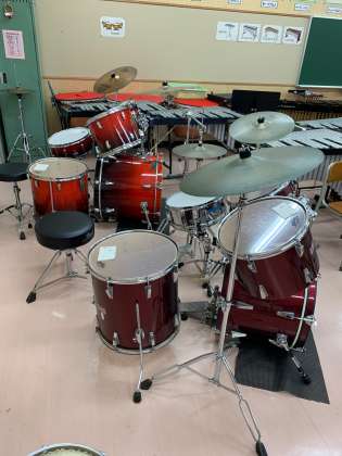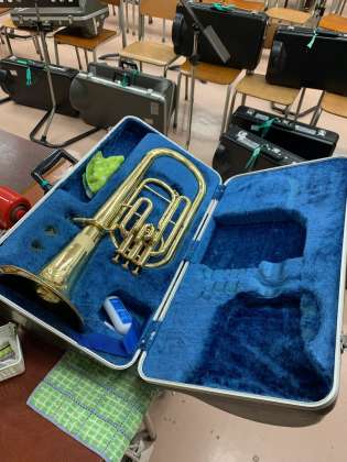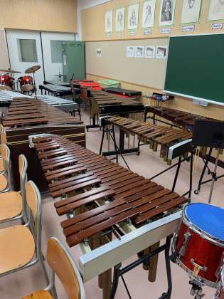 音楽室は静まり返っていて楽器たちもなんだか寂しそうです。打楽器などはホコリを払ってネジを締め直しました。金管バンド部員の使う楽器はオイルを差してメンテナンスを。準備はバッチリOKです。