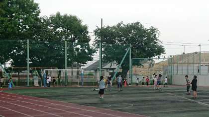 分散登校2日目。曇り空のもと休み時間に校庭で元気に遊んでいる子どもたちです。じゃんけんは少し離れてうでを伸ばしてやっていますね。遊び方も人との間をあけて、工夫しているのがわかりました。