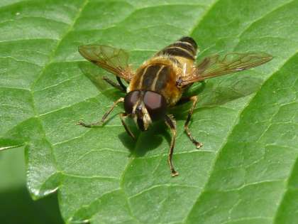 アジサイの花にやってきたハナアブ。その幼虫は、昔から不思議な姿で知られている。子どもたちが最初に見つけたときは、ビックリして飛んできた。
