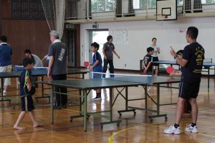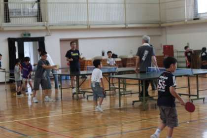 親子対抗戦、児童シングルス戦、児童ダブルス戦、大人の部などの試合があり、終わった後の懇親会では、お菓子や飲み物、そして優秀な成績を収めた人たちに賞品が手渡されました。