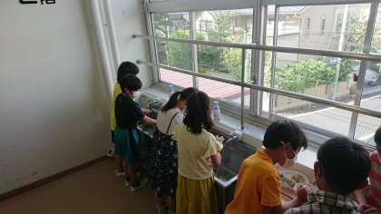 今日から、中央階段の近くに手洗い場が増設されて使えるようになりました。三密を避けるために、これまで少なかった水道を増やしてもらったものです。利用する分担を改めて、2階の中央は3年生、3階の中央は6年2組が使うことになりました。