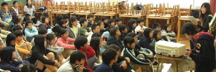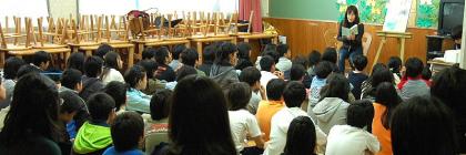 31日(金)3校時、本校6年生の「お話会」がランチルームで開かれました。いわゆる読み聞かせの会です。えっ!6年生に読み聞かせ?とお思いになる方もいらっしゃるでしょう。しかし、本校ではPTA有志の皆さんによる読み聞かせ活動が盛んで、各学年の保護者の方が読み聞かせグループをつくって活動されています。6年生のお話会もこの子たちが1年生のときからつづいていますから、6年生でも子どもたちは集中して聞く習慣が出t来ています。とはいっても、やはりグループの皆さんが本の選定や読み方を工夫して、ここまで築き上げてきたことも大きいと思います。