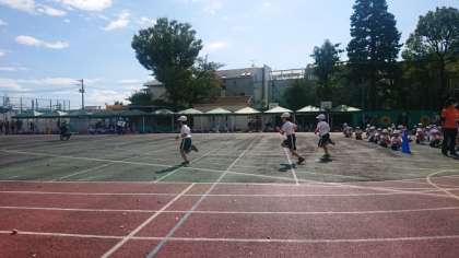 2年生の80メートル走です。手を大きくふりちからいっぱい走ります。